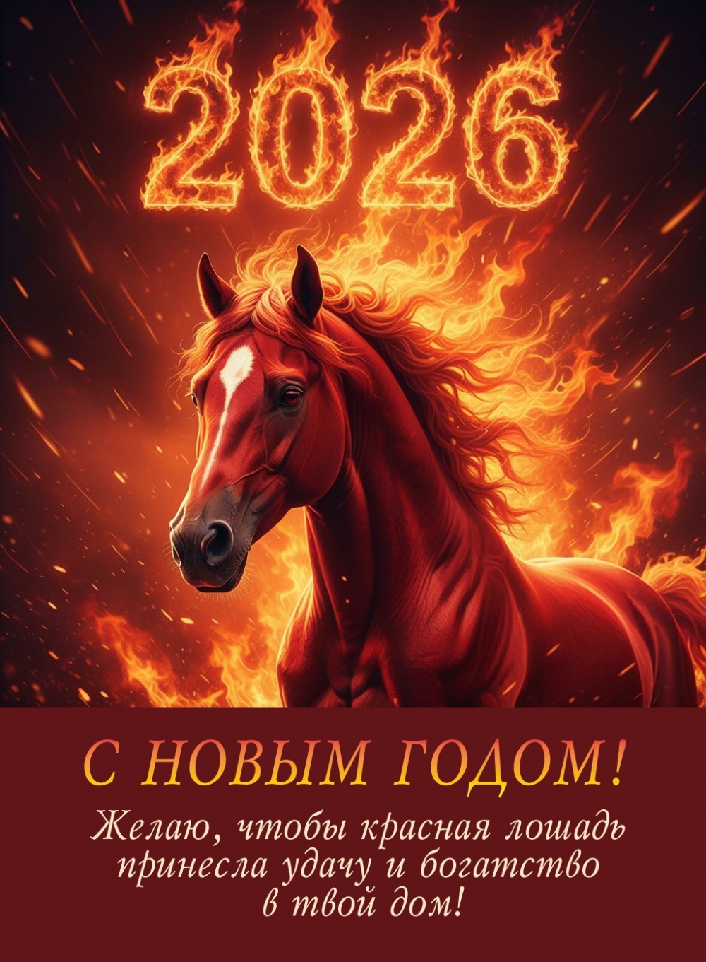Желаю, чтобы красная лошадь принесла удачу и богатство в твой дом!